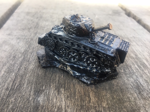 This Army Tank figurine is a unique piece of art handcrafted by skilled artisans from Kentucky using coal as its primary material. The rustic and primitive style of this figurine is perfect for home decor enthusiasts who appreciate the beauty of handmade items. The black color of the figurine gives it a bold and striking appearance, making it an excellent addition to any collection. Ideal for those who love sculptures and figurines, making it an excellent choice for those looking to enhance the aesthetic appeal of their living space. The Coal material used in this figurine adds to its unique charm and makes it a rare find for collectors. Get your hands on this beautiful figurine today and make it a part of your home decor collection. 3" x 2" x 1 1/2"