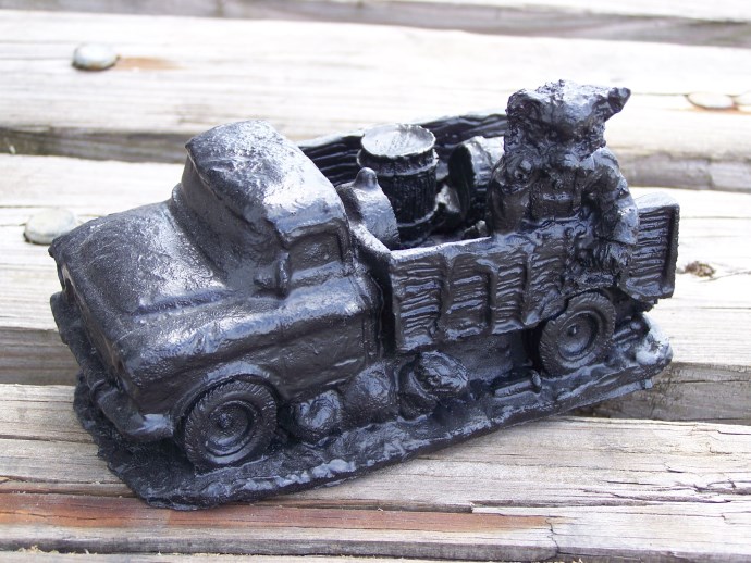 This unique figurine of a bear in a truck bed is a perfect addition to your home décor or table décor. It is handcrafted in Kentucky with high quality coal and shows exceptional craftsmanship. The coal used in this figurine is sourced from the United States, making it a patriotic piece of art. The attention to detail is outstanding, and it is sure to be a conversation starter in any room. This item is perfect for those who appreciate handcrafted and finished pieces, and it would make an excellent gift for anyone who loves unique and beautiful art. Add this bear in truck bed figurine to your collection today and enjoy its beauty for years to come.