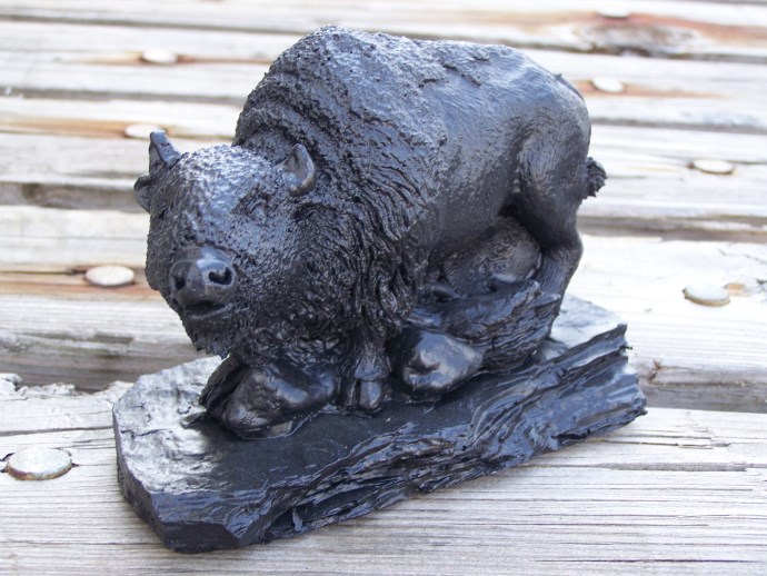 This handcrafted Buffalo figurine is a unique piece of art made by skilled artisans from Kentucky. It is made from coal, which gives it a rustic and primitive look. The figurine is 4 inches long and comes in a beautiful black color, making it a perfect addition to any home décor. The United States is the country of manufacture, making it a great way to show support for local artists. This figurine falls under the category of sculptures & figurines, home décor, and home & garden. Its theme is coal, which is evident in its material. 5 1/2" X 4"