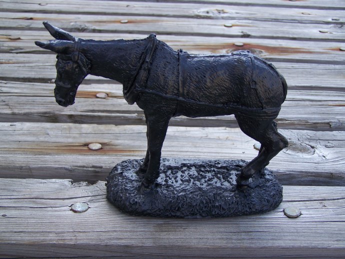 This exquisite figurine is a unique piece of art that will add a rustic touch to your home décor. Handcrafted from coal in Kentucky, this mule figurine boasts intricate details that make it a true masterpiece. The coal material gives it a distinct black color that perfectly matches any room's color scheme. The figurine is made in Kentucky, where skilled artisans carefully crafted it. With its rustic/primitive style, the figurine is sure to be a conversation starter among your guests. Add this coal-made mule figurine to your collection of sculptures and figurines today. 8" X 6" X 3"