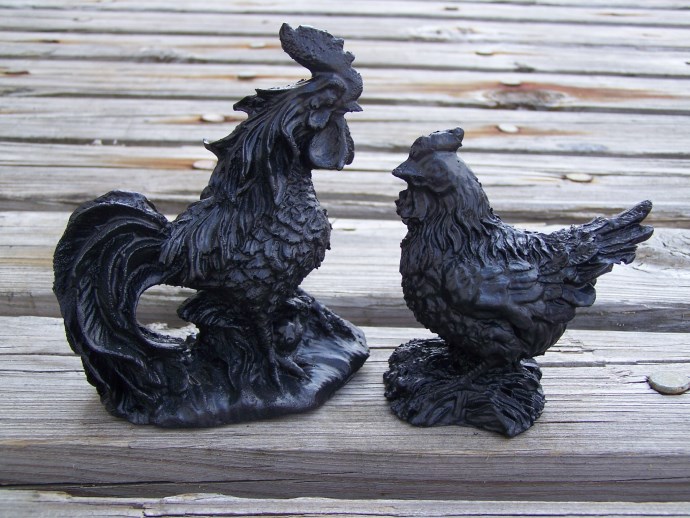 Add a touch of rustic charm to your home décor with this unique figurine set handcrafted by skilled artisans in Kentucky. Made from genuine coal, the rooster and hen figurines feature intricate detailing and a beautiful black color. Perfect for collectors, these pieces are sure to stand out in any room with their rustic/primitive style and theme of coal. This set of figurines is a great addition to your collection and can be used as a centerpiece or decorative accent in your home or garden. The quality and craftsmanship of these pieces are second to none and will be a conversation starter for years to come. Don't miss out on this opportunity to own a one-of-a-kind set of figurines. Rooster 5" X 4"